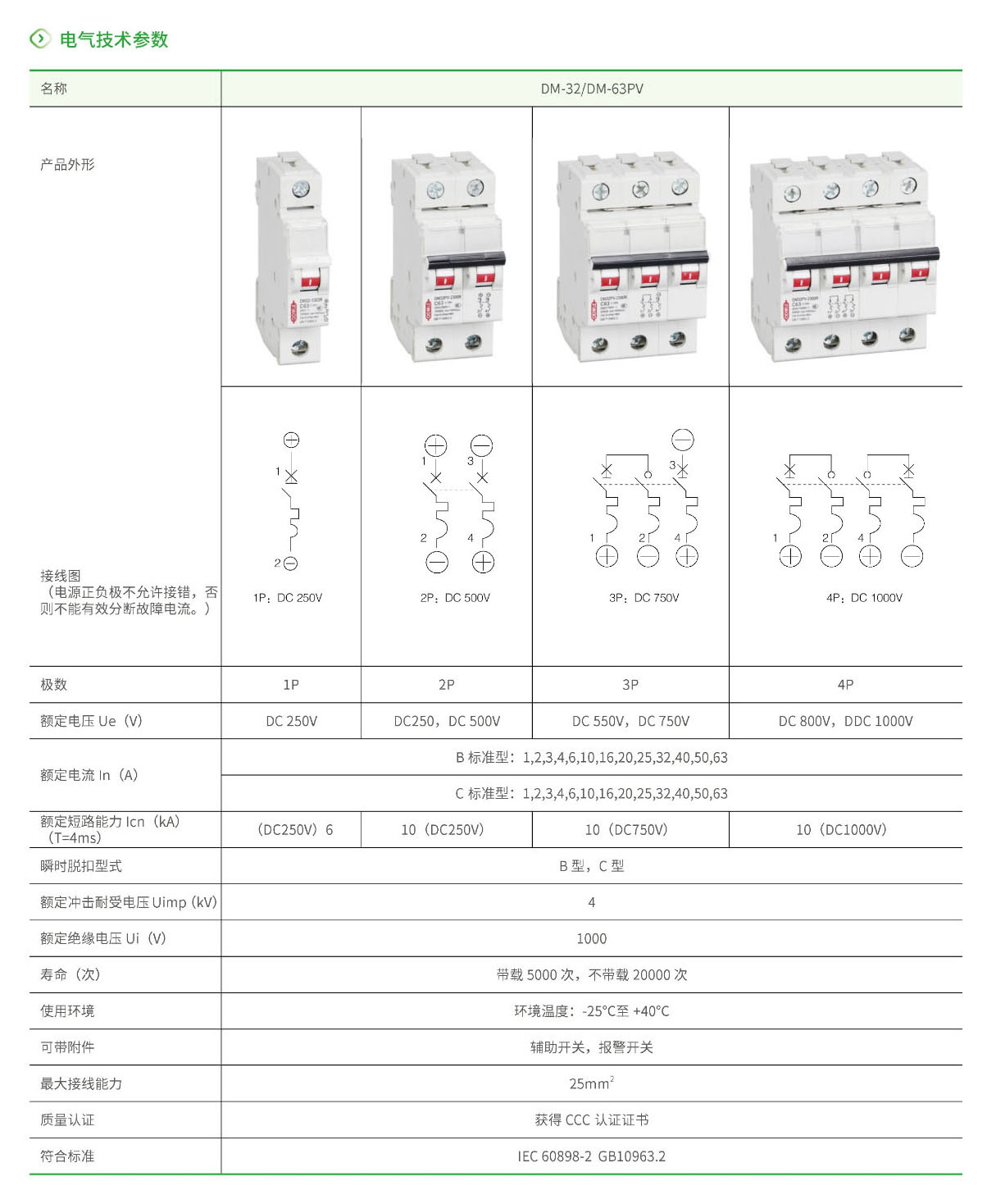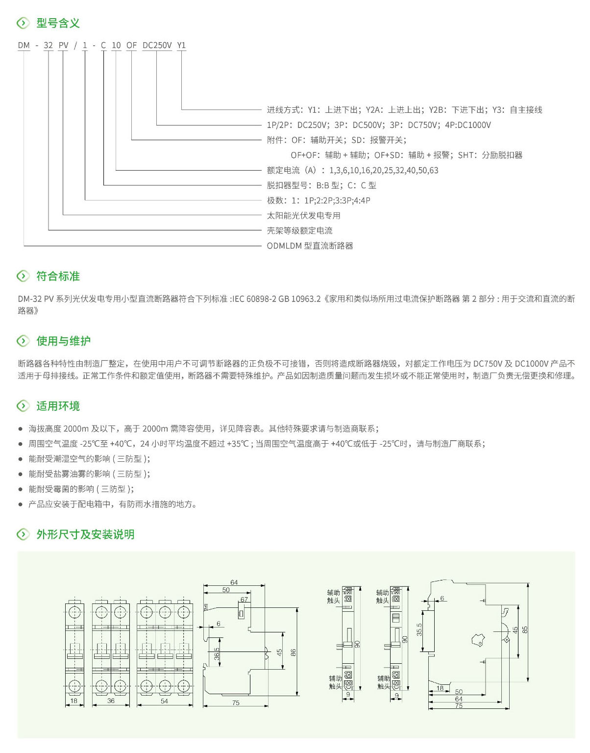DM-32太陽(yáng)能光伏發(fā)電專用小型直流斷路器額定工作電壓可以高至DC 1000V,該斷路器采用特殊的滅弧、限流系統(tǒng),可以迅速分?jǐn)嘀绷髋潆娤到y(tǒng)的故障電流,保護(hù)太陽(yáng)能光伏發(fā)電系統(tǒng)中的重要器件——光伏模塊免受高DC反向電流和因逆變器故障導(dǎo)致的AC反饋電流的危害,保證了太陽(yáng)能光伏發(fā)電系統(tǒng)可靠的運(yùn)行。