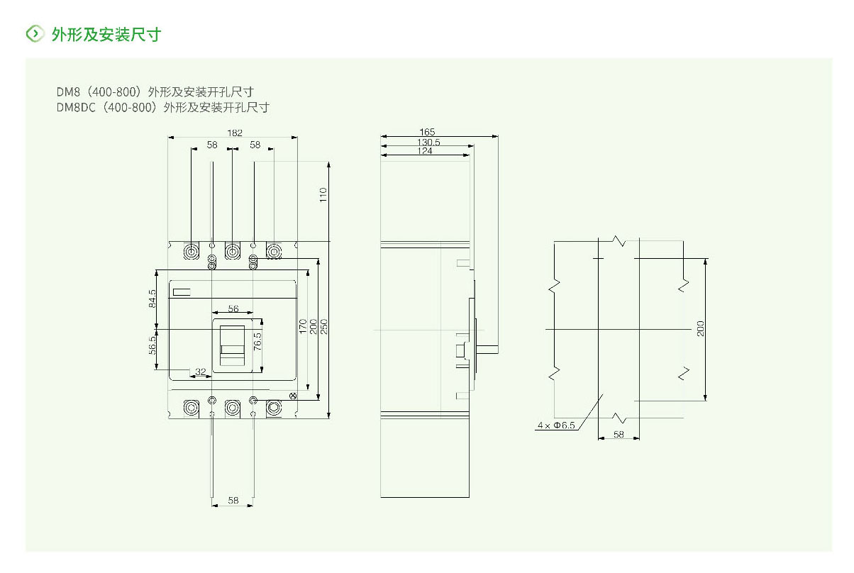 ●DM/DM8系列塑殼直流斷路器AC1000V電壓下分?jǐn)嗄芰Ω哌_(dá)40kA,DC1500V/25kA能可靠實(shí)現(xiàn)系統(tǒng)短路保護(hù)。