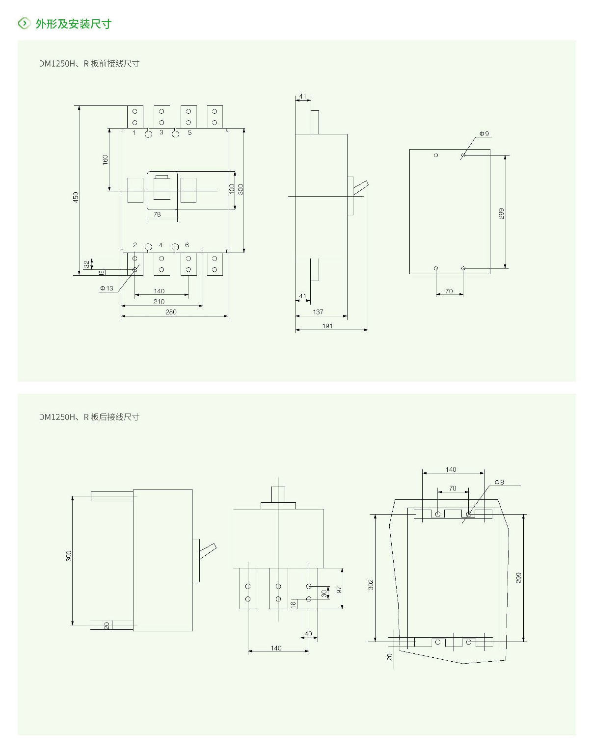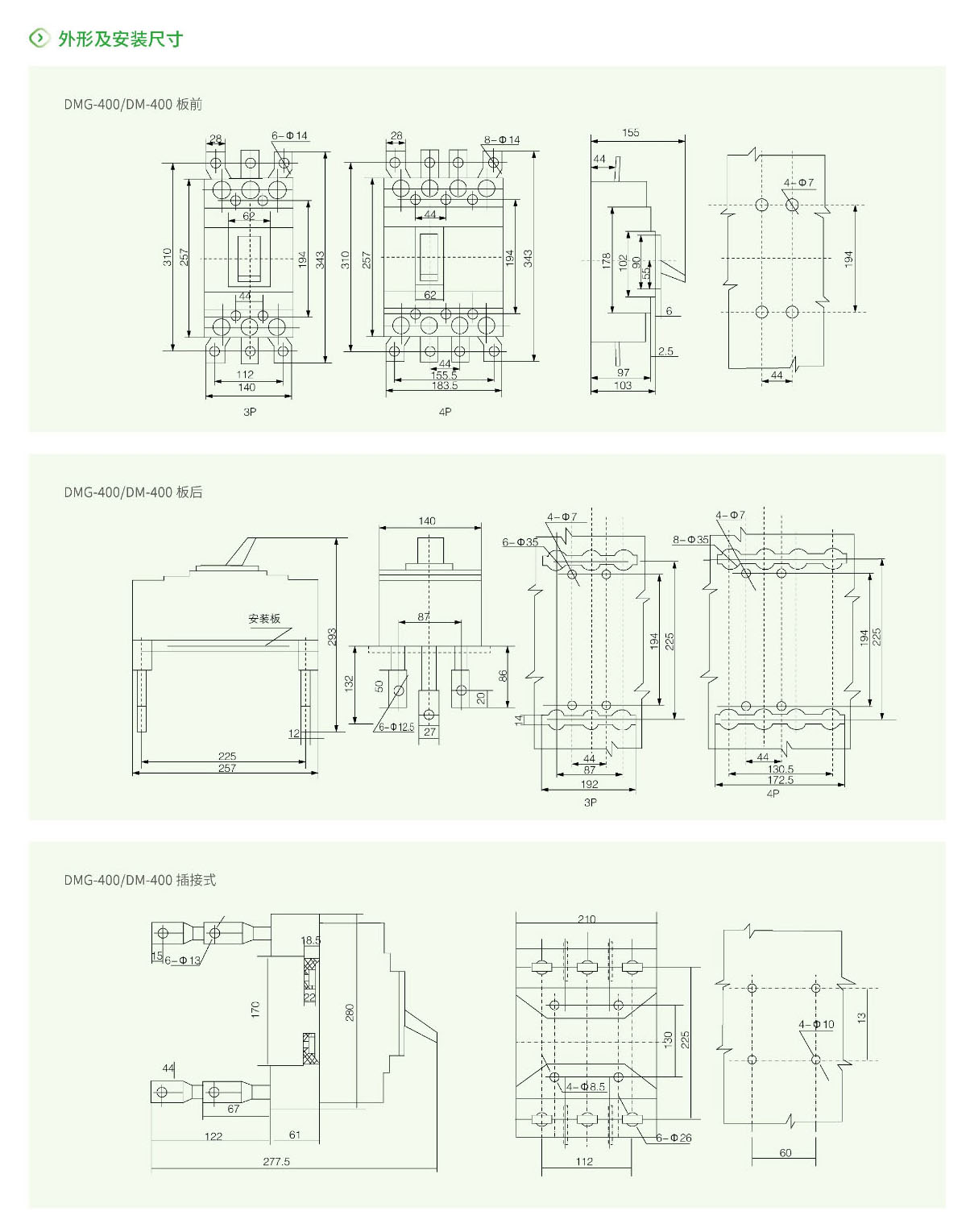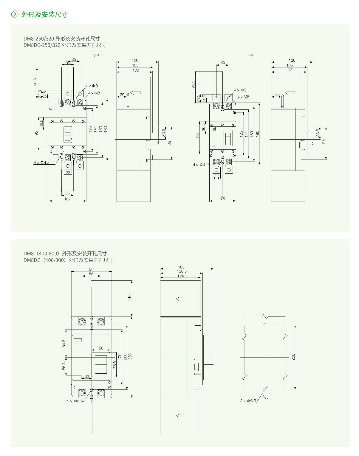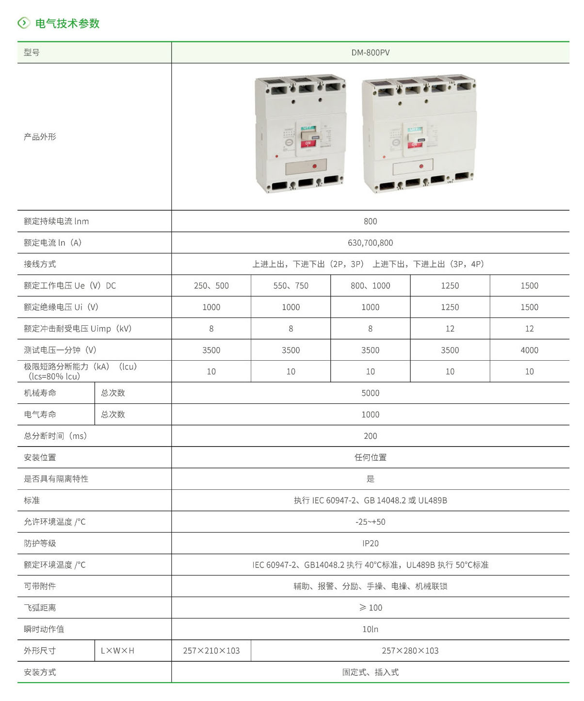 ●DM/DM8系列塑殼直流斷路器AC1000V電壓下分?jǐn)嗄芰Ω哌_(dá)40kA,DC1500V/25kA能可靠實(shí)現(xiàn)系統(tǒng)短路保護(hù)。